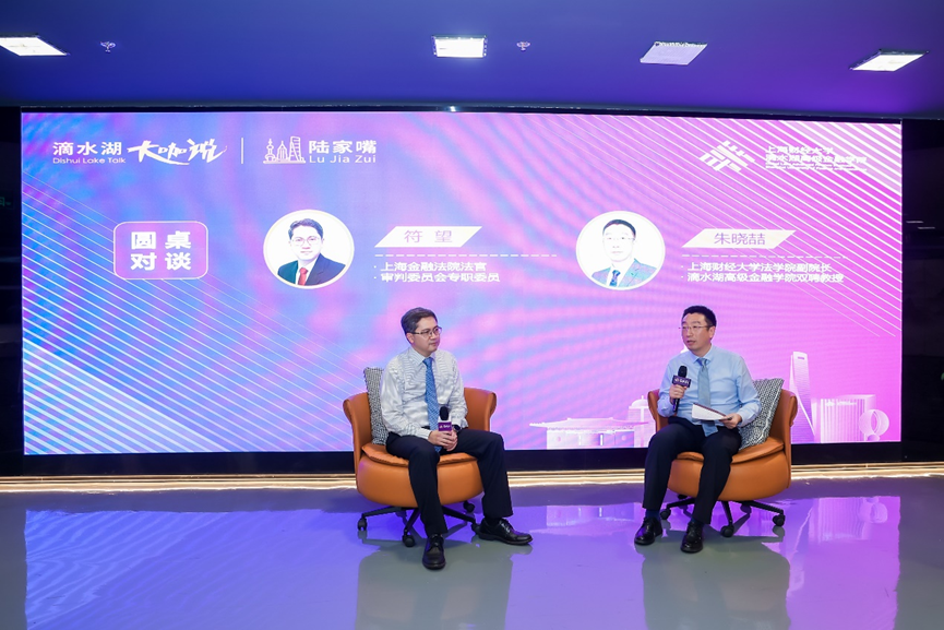 在随后的圆桌对话环节,上海财经大学法学院副院长、滴水湖高级金融学院双聘教授朱晓喆先生作为嘉宾,与符望法官一同探讨了金融司法对市场的影响。