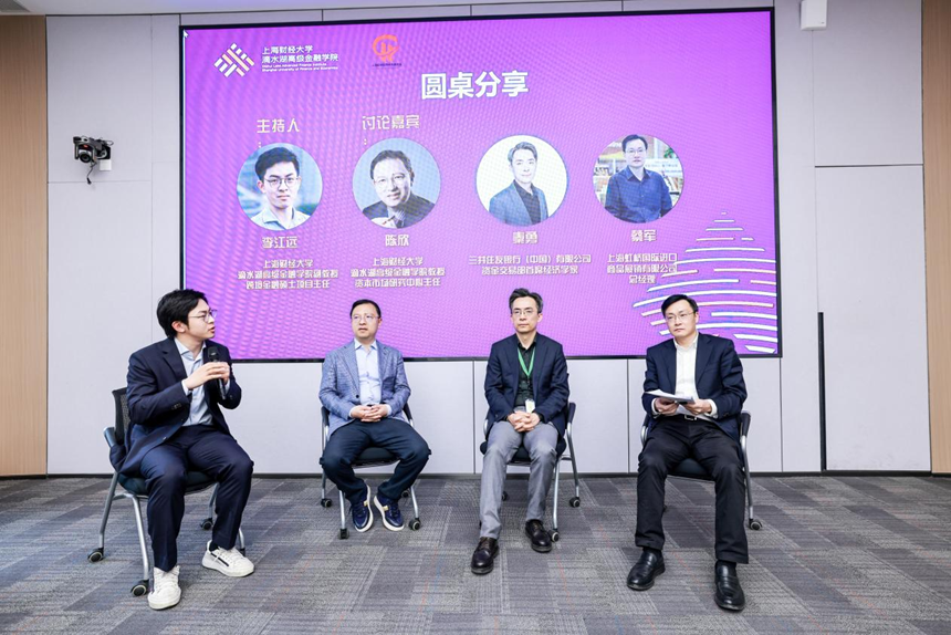 在压轴的圆桌对话环节,李江远副教授主持讨论,特邀上海财经大学滴水湖高级金融学院教授、资本市场研究中心主任陈欣,三井住友银行经济学家秦勇,以及上海虹桥国际进口商品展销有限公司总经理蔡军,共同就“中美关税战下的贸易重构与风险管理”展开多维度探讨。三位嘉宾结合理论分析与实践经验,在供应链稳定、政策响应、金融工具运用等不同视角下,分别提出了富有启发性的观点,为企业管理者们提供了应对当前贸易形势的具体策略。