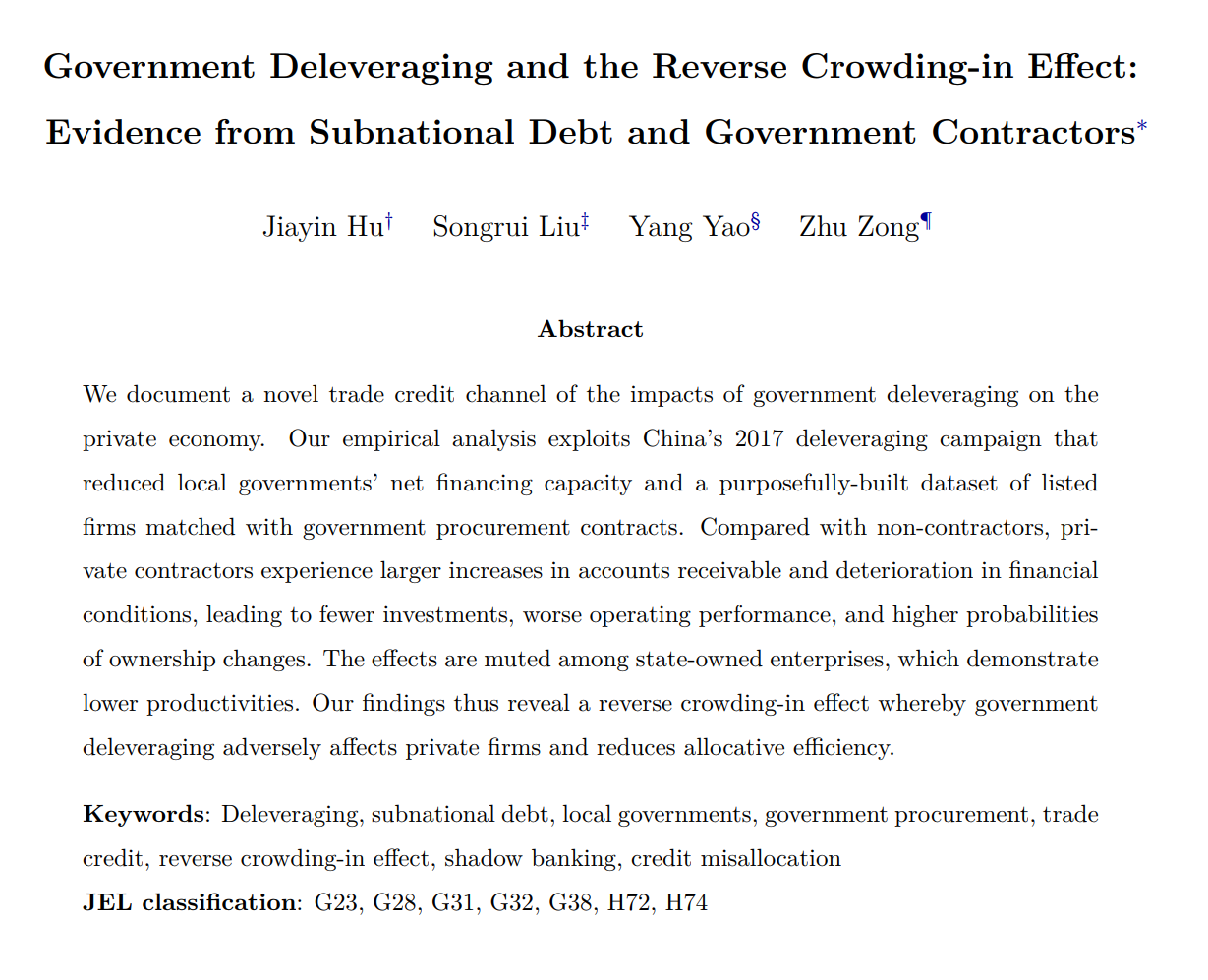 论文引用:Hu, Jiayin, Songrui Liu, Yang Yao, and Zhu Zong. 2025. “Government Deleveraging and the Reverse Crowding-in Effect: Evidence from Subnational Debt and Government Contractors.” Accepted at Management Science.