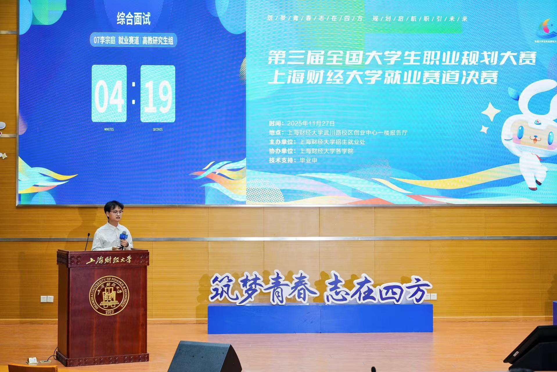 11月27日下午,在第三届全国大学生职业规划大赛上海财经大学校赛决赛中,我院2025级金融硕士(人工智能金融方向)李宗庭同学凭借清晰的职业规划、扎实的专业素养和出色的现场表现,荣获就业赛道二等奖。