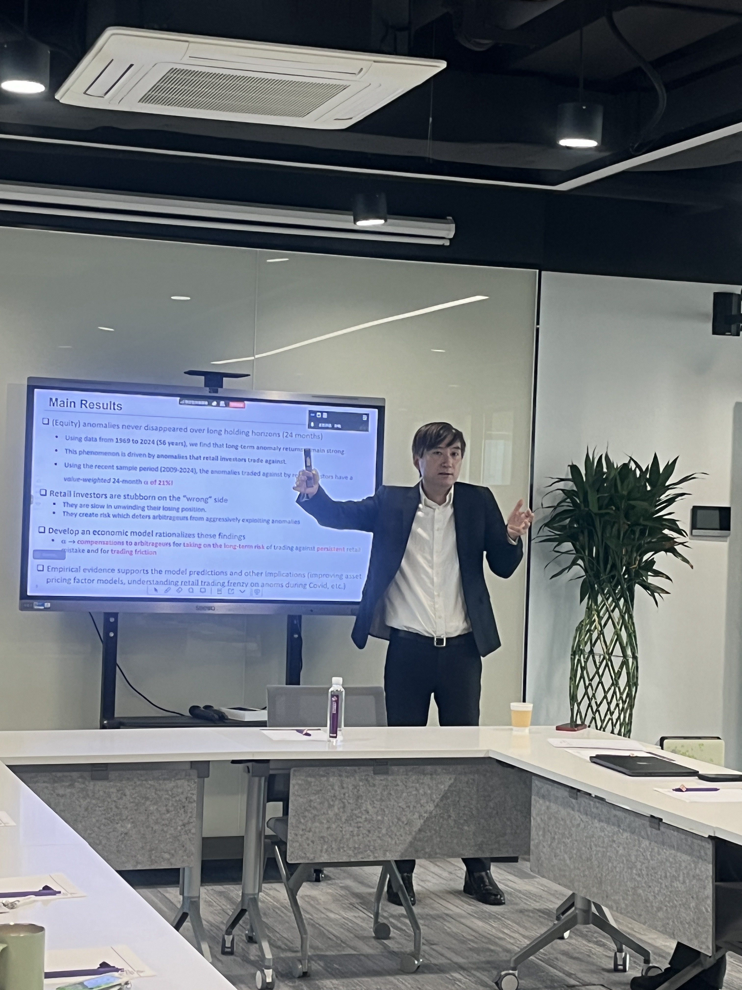 2025年12月9日,上财滴水湖高级金融学院第十四期常规学术报告在622会议室顺利举办。巴鲁克学院董玺教授受邀,就其团队研究成果《Anomalies Never Disappeared: The Role of Stubborn Retail Investors》发表了深度演讲。学院教师团队参与了本次学术活动,就市场效率、投资者行为与套利限制等议题展开了热烈探讨。