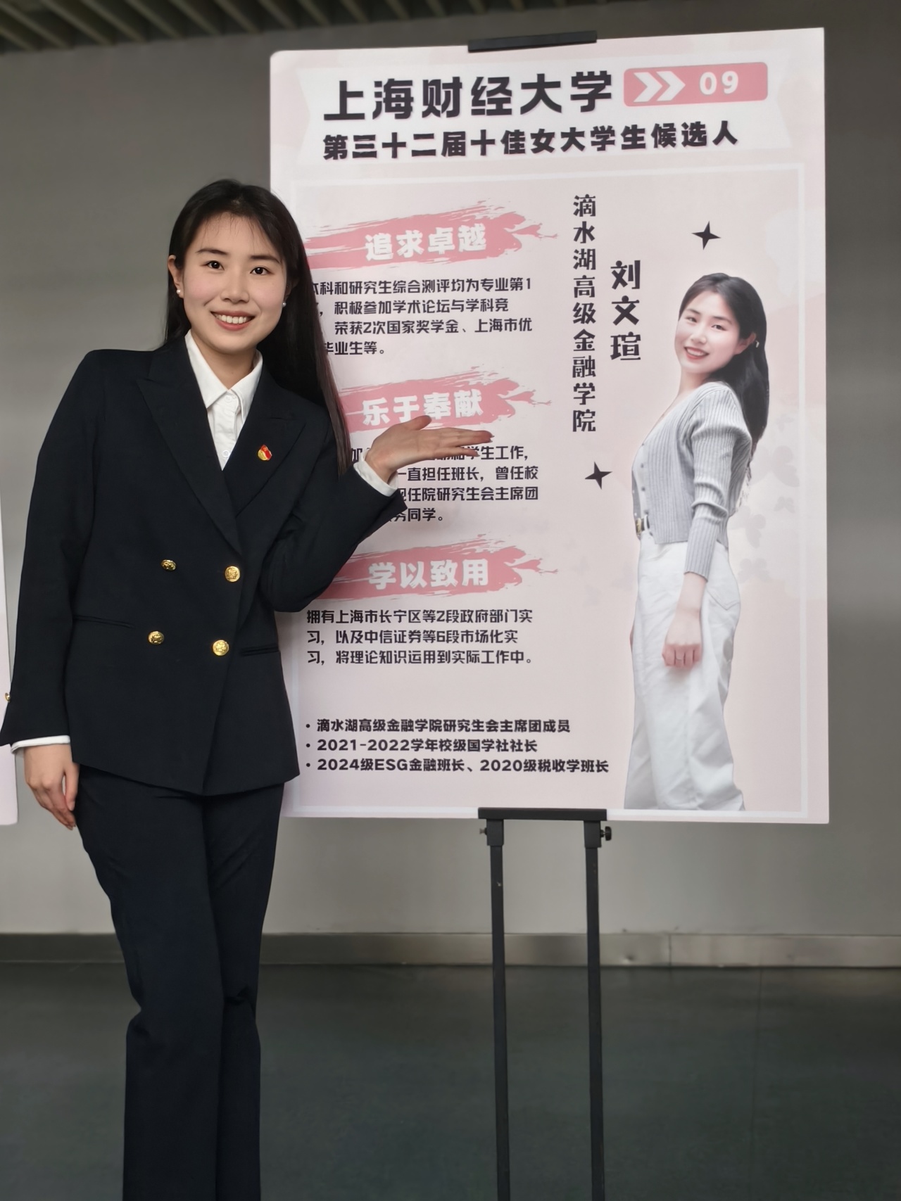 2025年12月19日,上海财经大学第三十二届 “十佳女大学生” 评选活动圆满落幕。滴水湖高级金融学院2024级金融专业研究生刘文瑄凭借全面突出的综合表现斩获提名奖,用青春行动诠释了新时代青年的责任与荣光。接下来,让我们听听她的故事: