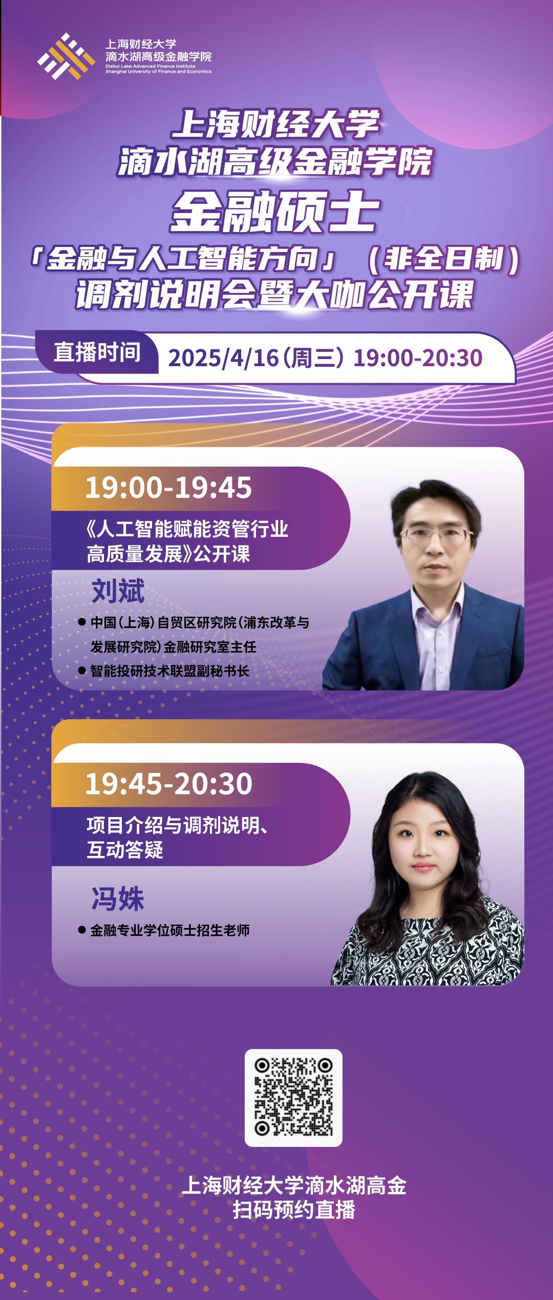 在数字经济浪潮席卷全球的今天,人工智能正以颠覆性力量重塑金融行业的未来。从智能投研到量化交易,从风险管理到资产配置,AI技术已成为驱动金融创新的核心引擎。 当金融遇上AI,未来已来!上海财经大学滴水湖高金立足金融前沿,开设非全日制「金融与人工智能方向」金融硕士项目,致力于培养“懂金融、通技术、善实战”的复合型人才。4月16日(周三)19:00,上财滴水湖高金举办非全日制金融专硕「金融与人工智能方向」调剂说明会暨大咖公开课!特邀中国(上海)自贸区研究院(浦东改革与发展研究院)金融研究室主任、智能投研技术联盟副秘书长刘斌先生与学院招生老师,为您打开一扇洞察趋势的窗口——在这里,读懂AI与金融的深度融合,探索求学发展的全新可能!