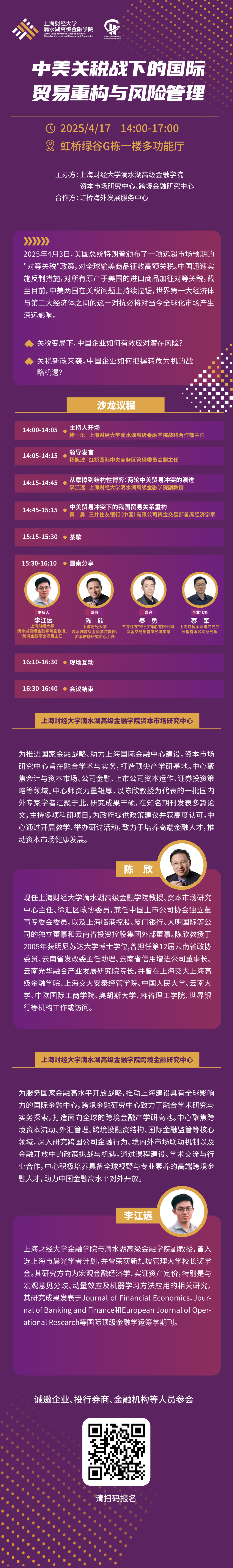 上海财经大学滴水湖高级金融学院资本市场研究中心与跨境金融研究中心将于2025年4月17日举办《中美关税战下企业的投资战略与风险管理》沙龙,特邀上海财经大学滴水湖高级金融学院副教授李江远,三井住友银行(中国)有限公司资金交易部首席经济学家秦勇解读关税带来的危与机。上海财经大学滴水湖高级金融学院教授、资本市场研究中心主任陈欣将参与圆桌探讨。