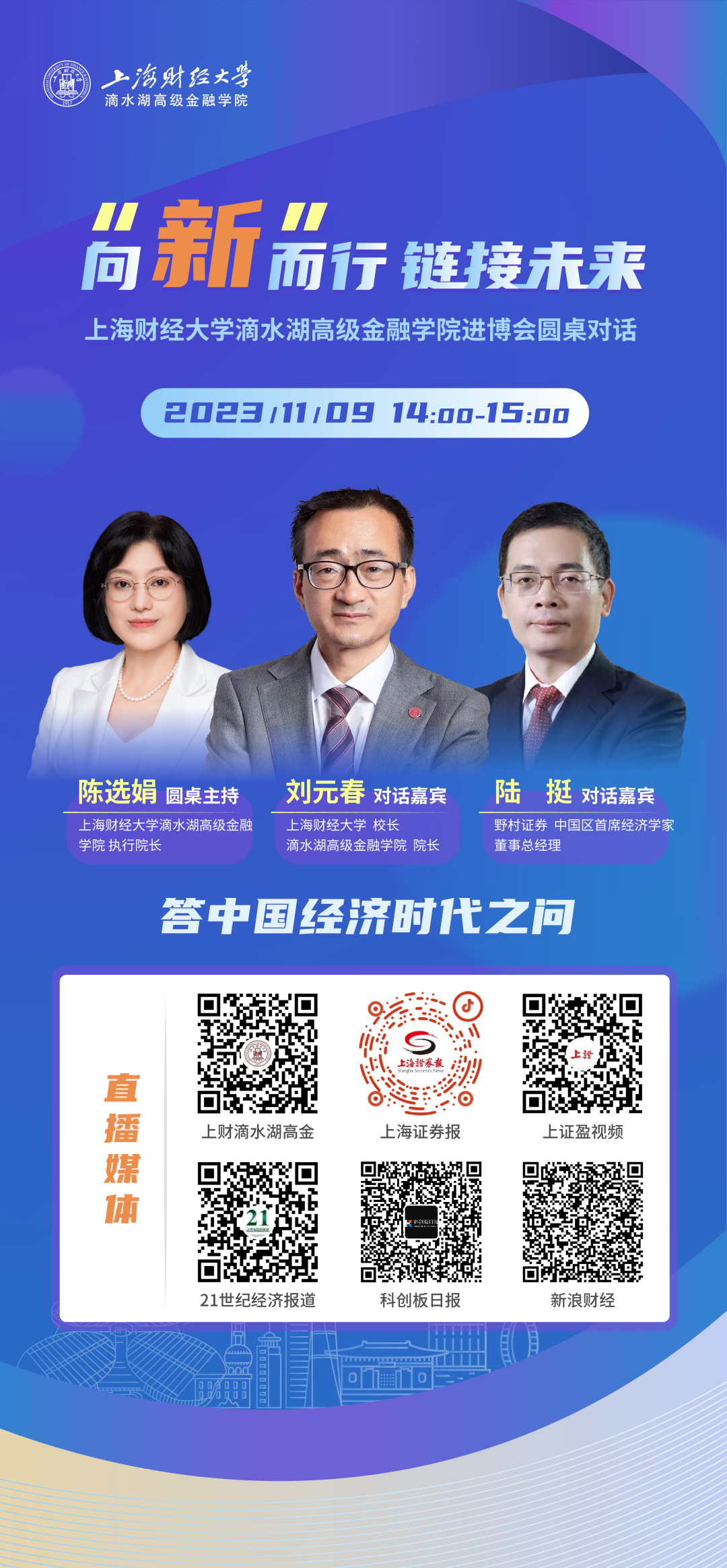 Committed to upholding a century-old business culture and becoming a world-class finance school leading the development of emerging finance, Dishui Lake Advanced Finance Institute, Shanghai University of Finance and Economics (SUFE-DAFI), will participate in the CIIE as a key member of the “Lin-gang Matrix”. On November 9, the Institute will hold a roundtable dialogue with the theme of “Embracing the New, Linking the Future”. Liu Yuanchun, President of SUFE and Dean of SUFE-DAFI, Lu Ting, Chief China Economist and Managing Director of Nomura Securities, and Chen Xuanjuan, Executive Dean of SUFE-DAFI, are invited to have a dialogue on current economic issues.