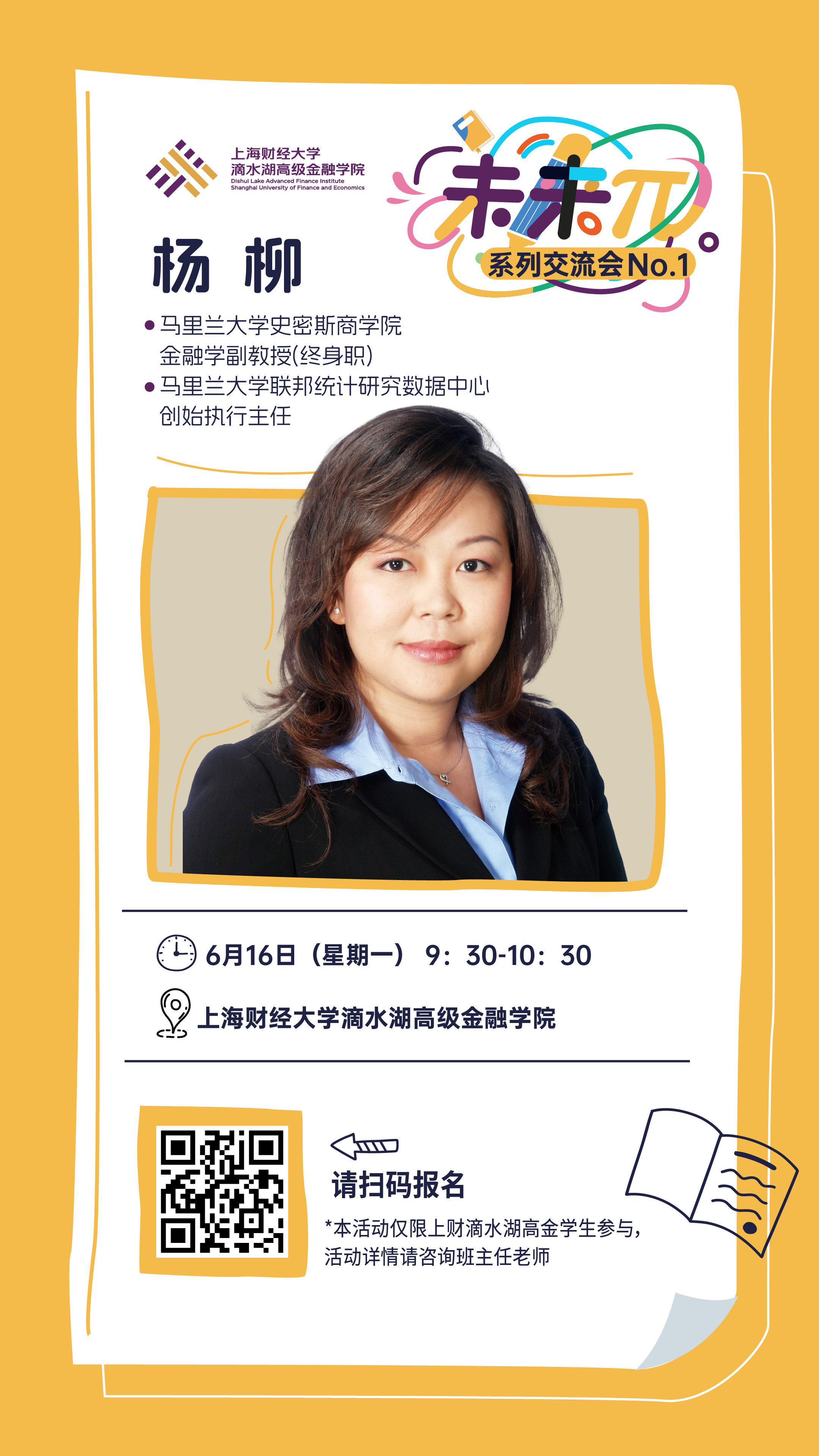 当人工智能重塑金融业态,当数字货币颠覆传统货币体系,当ESG成为全球共识,我们正站在金融变革的历史拐点。这个时代呼唤的将是具备前瞻思维、敢于探索未知的金融新锐。 正如“π”这个看似简单却象征着无穷的数字。在这个充满无限可能的时代,我们需要的正是这种永不止步的探索精神和突破边界的勇气。MF「未来π」系列交流会应运而生,致力于打造面向金融硕士学生的前沿思维启发平台。学院汇聚学术泰斗与行业领袖,旨在以π的无限延展特性激发学生的无限可能,助力大家在金融变革的浪潮中找到属于自己的成长路径。 「未来π」第一期特邀马里兰大学史密斯商学院杨柳教授,她将结合从学术研究到业界实战的丰富阅历,与同学们深入交流学术、职业规划和人生成长等话题。 活动时间 6月16日(星期一) 9:30-10:30 活动地点 上财滴水湖高金学院619教室 多维视角,不负关注 继续探索我们在各大平台的精彩内容…